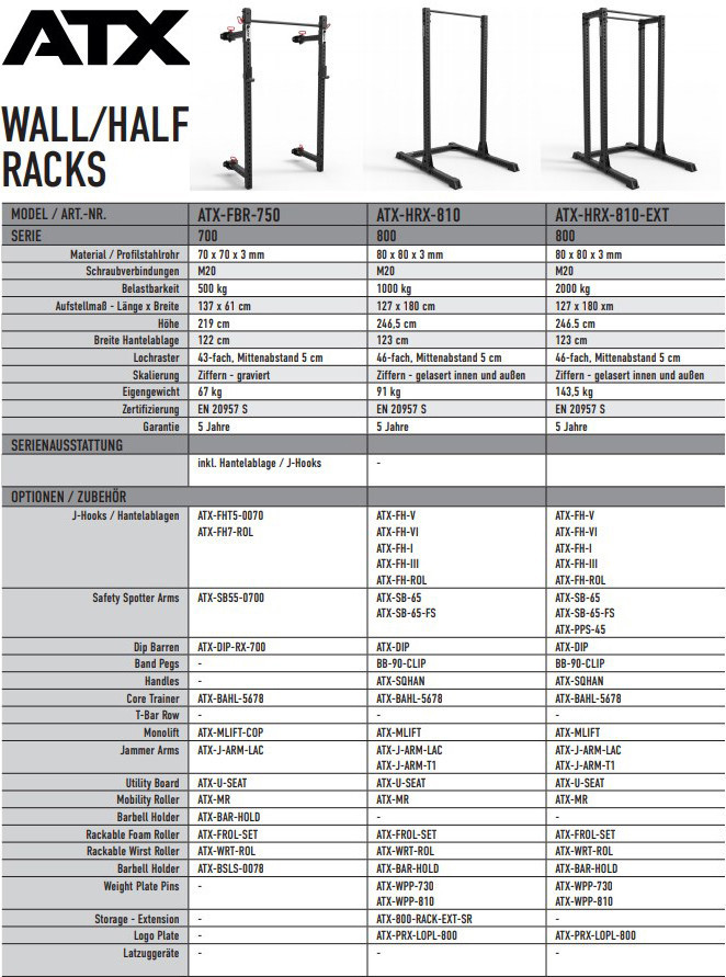 Nástěnný Half Rack značky ATX s pohodlným a prostorově úsporným designem, který lze v několika snadných krocích složit. Konstrukce má po složení pouze 13 cm do hloubky a ušetří tak mnoho místa. Stojan je vyroben z odolných 70 x 70 x 3 mm ocelových trubek s nosností až 500 kg. Nabízí 43 výškových pozic, které jsou opatřeny číslováním pro přesné a rychlé nastavení dle potřeb. Vyznačuje se prvotřídním zpracováním, je vyroben podle nejvyšších standardů kvality a certifikován podle normy EN 20957 I.II.IV třída S. Pro rozšířený rozsah cvičení lze Half Rack rozšířit o další volitelné příslušenství. Ke stojanu jsou volitelně dostupné upevňovací lišty ATX-FBR-MRAIL pro snazší instalaci stojanu na zeď a opticky lepší vzhled.