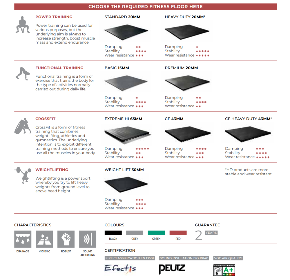 robustní konstrukci efektivně tlumí nárazy, chrání podkladovou plochu a výrazně snižuje hlučnost. Vysoká hustota materiálu zajišťuje vynikající odolnost vůči poškození, například při pádu těžkých činek či kotoučů. Navíc podlaha zaujme svým moderním vzhledem, snadno se udržuje a její povrch je protiskluzový, což zajišťuje bezpečný a plynulý pohyb i při dynamických cvičeních. Díky těmto jedinečným vlastnostem je podlaha PREMIUM perfektní volbou pro činkové zóny (free weight), kde se pracuje s volnými váhami.