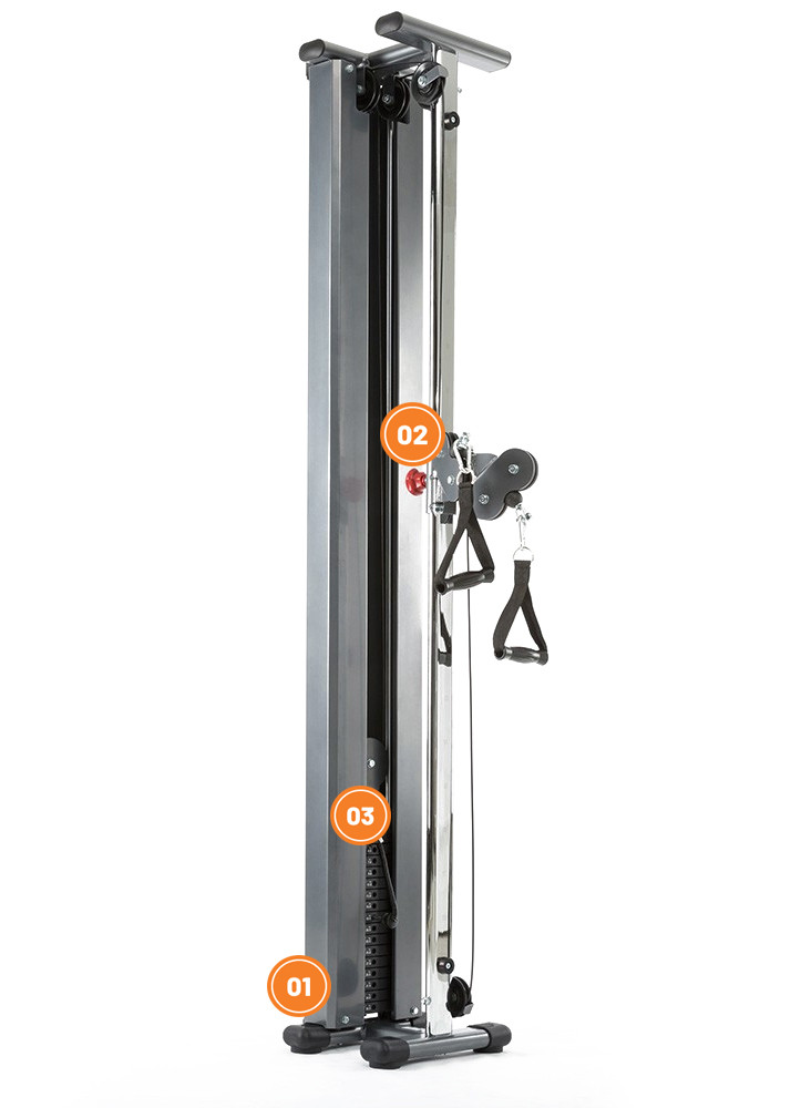 Výškově nastavitelné otočné kladky, díky kterým lze snadno a rychle nastavit širokou škálu různých úhlů- Kladky jsou na kuličkových ložiscích, která zajišťují plynulý a tichý chod